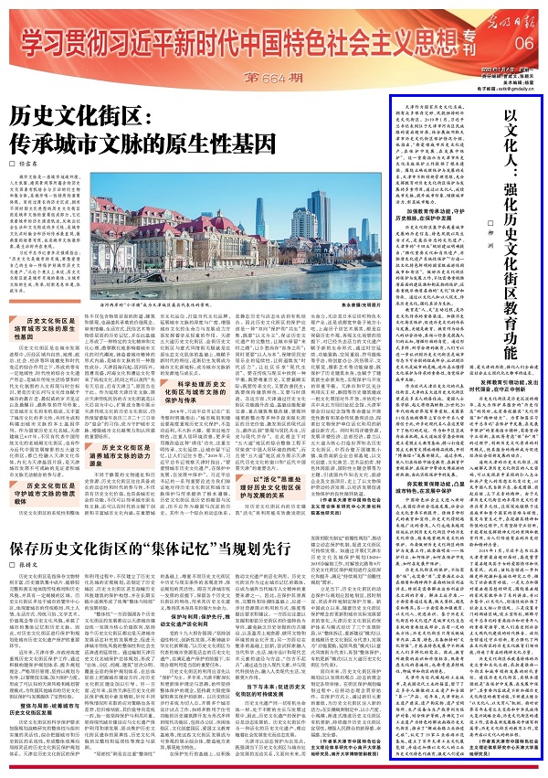 历史文化街区承载着特殊的历史之重和文化之韵,承担着推动一个街区和城市创新发展的时代责任。建设历史文化街区,其根本遵循就是“在保护中发展、在发展中保护”,其重要内容就是不断加强历史文化街区的教育功能、不断建立健全“以文化人、以文育人”机制。面对世界百年未有之大变局和中华民族伟大复兴战略全局,历史文化街区的建设工作,需要在新发展格局中谱写新篇章;历史文化街区的教育工作,需要开启以文化人的新征程。