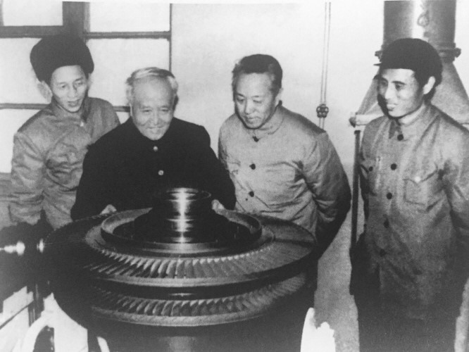 1968年,师昌绪(左二)到工厂检查发动机涡轮盘。