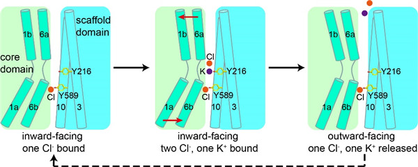 KCC1共转运钾离子和氯离子的模型。第二个氯离子首先结合在第二位点,然后钾离子和第一个氯离子结合;KCC1的构象由内向态向外向态转变,钾离子和第一个氯离子释放至细胞外。 天津大学供图