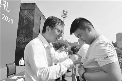 ▼同济大学校长陈杰为新生佩戴校徽。