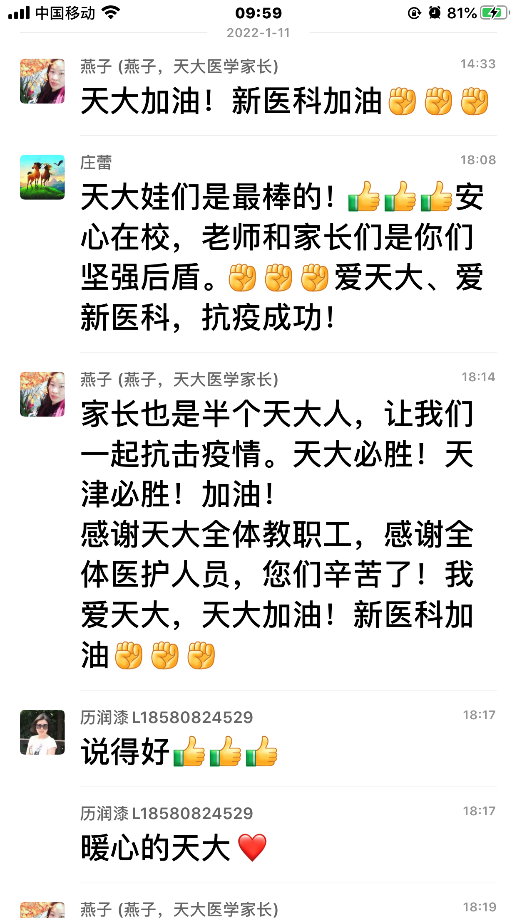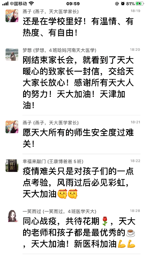 一根细细的网线,讲述着天津大学一段段感人的抗疫乐章,串联起无数家庭守望与温情,一场疫情之下暖心的双向奔赴,就此拉开。家长会结束后,家长们纷纷表达了对学校疫情防控工作的理解和支持,也鼓励自己的孩子在防疫中要积极参与学校的疫情防控志愿服务工作。“家长也是半个天大人,让我们一起抗击疫情,天大必胜,天津必胜!”“天大娃们是最棒的,安心在校,老师和家长是你们的坚强后盾!”