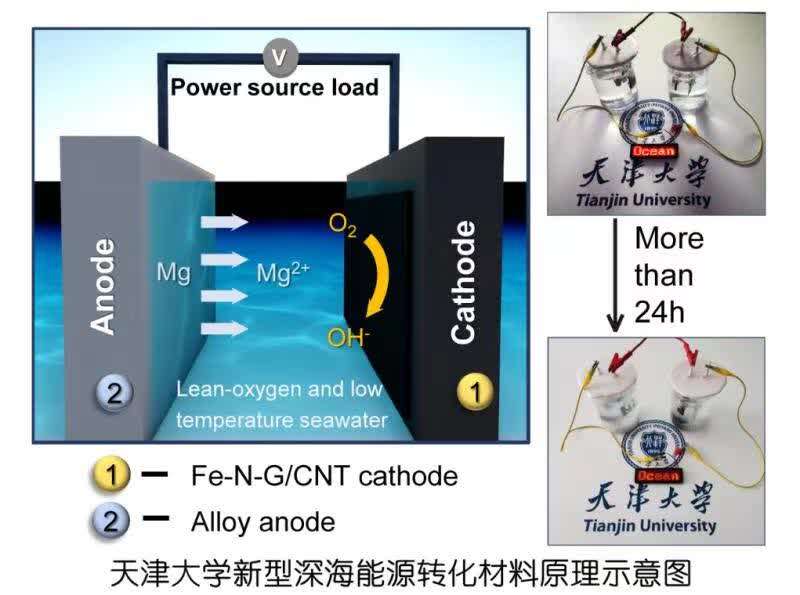 天津大学海洋学院、化工学院联合团队提出了“面向深海贫氧环境海水电池高效亲氧催化剂”的设计策略,他们通过微波合成法制备出一种新型单原子催化剂。实验结果显示,这种新材料能够在贫氧环境下进行高效氧还原催化,从而产生电能。用这种新材料制造的海水电池能够在水下超千米的深海环境中稳定供电。