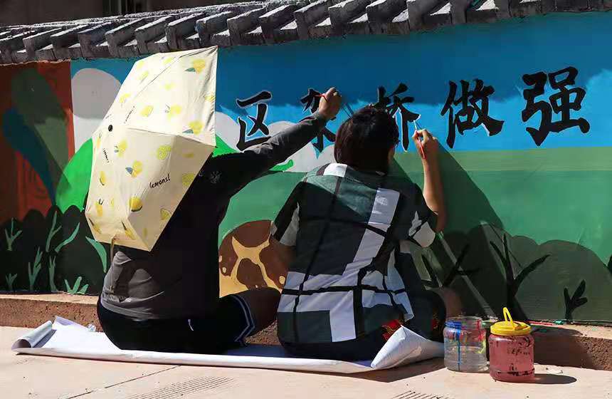 暑期实践队在绘制景观墙