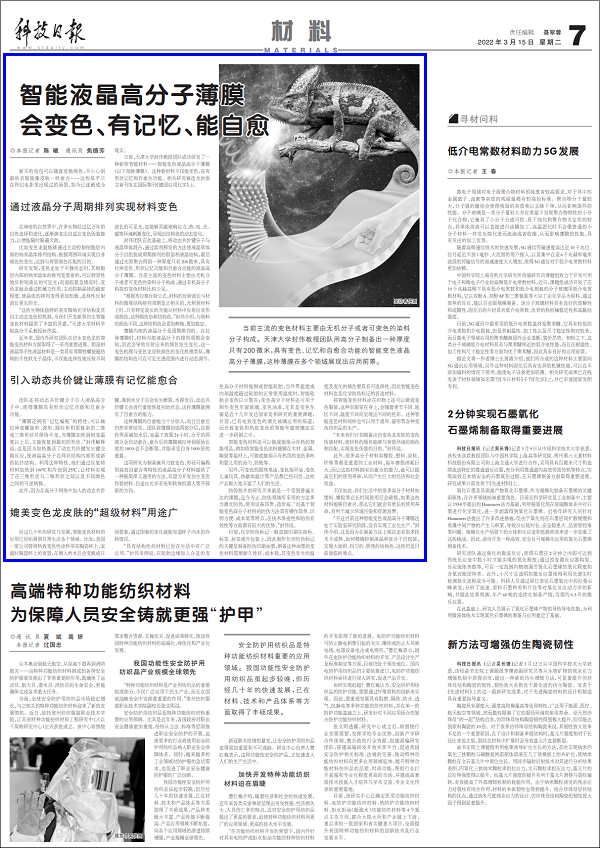 日前,天津大学封伟教授团队成功研发了一种新型智能材料——智能变色液晶高分子薄膜(以下简称薄膜)。这种新材料不仅能变色,还有形状记忆和自愈合功能。相关研究被选为封面文章刊发在国际期刊《德国应用化学》上。