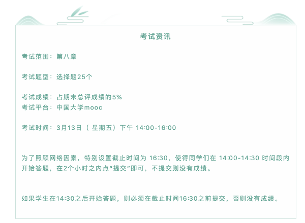 天津大学拥有月考的传统。因为疫情的原因,原本的高数线下月考不能如期进行,任课老师便通过在线课程平台,发布考试通知及相关试题。为了照顾网络因素,特别设置交卷截止时间为 16:30,同学们在 14:00-14:30 时间段内开始答题,在2个小时之内点“提交”即可,不提交则没有成绩。
