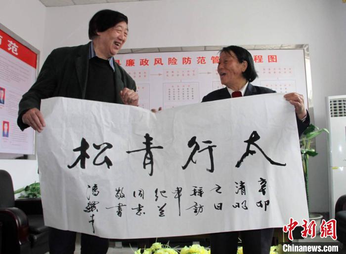 2011年4月,冯骥才在西沟展览馆参观期间,书赠申纪兰“太行青松”,以此表达她对申纪兰的敬意。(资料图片) 陆祁国 摄