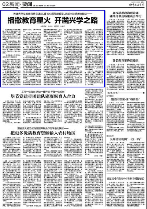 “教育扶贫是管长远、管根本的治本之策,要彻底解决贫困问题,关键就是解决教育问题。”天津大学党委书记李家俊说,“用高校资源带动偏远贫困地区发展,将教育之火播撒到乡村,这是新时代中国大学的担当。”