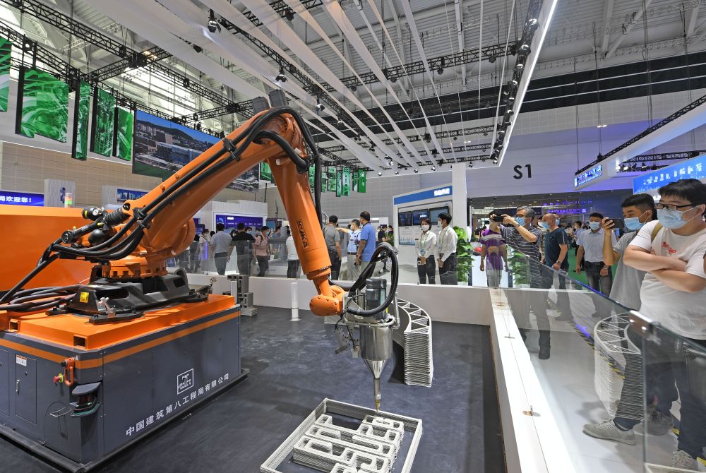 6月24日,在国家会展中心(天津)一期展馆,观众在参观中建八局展厅内的建筑3D打印机器人。新华社记者 赵子硕 摄