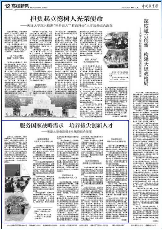 “深入实施新时代人才强国战略,加快建设世界重要人才中心和创新高地,这为学校人才培养和队伍建设指明了新方向、提出了新要求。”天津大学党委书记杨贤金说,天津大学将全面落实立德树人根本任务,服务国家重大战略需求,融入国家和区域经济发展,把论文写在祖国大地上,培养合格的社会主义建设者和接班人。