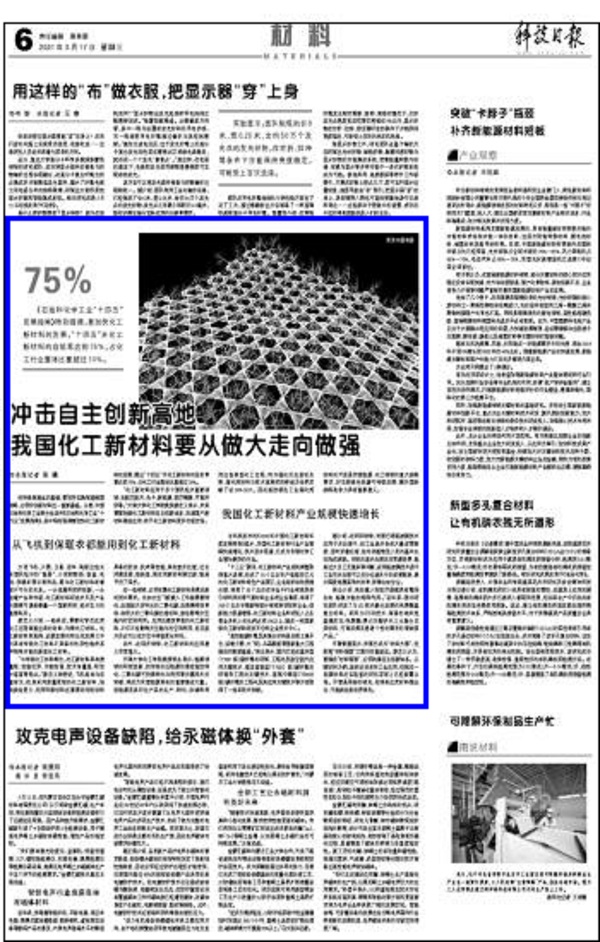大到飞机、火箭、卫星、动车、轮船这些关系国民经济的“重器”,小到购物袋、饭盒、电池、保暖衣等日常用品,都与化工新材料有着密不可分的关系。一头连着科技和创新,一头连着产业和市场,化工新材料研发水平及产业化规模可谓是衡量一个国家科技、经济实力的重要标志。