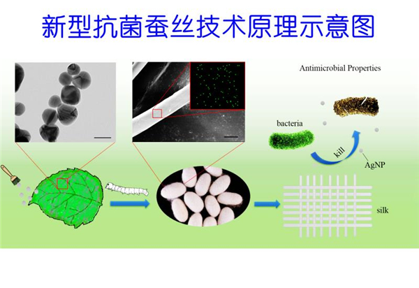 纳米银具有抗菌能力强、安全性高、不易产生抗药性等优点,已被广泛用于各种抗菌材料,例如抗菌织物和器械。天津大学张雷教授团队利用一系列不同粒径的纳米银颗粒喂食家蚕,研究纳米银颗粒在不同器官中的分布、积累情况。实验结果显示:粒径为50纳米的银颗粒最容易被家蚕摄取和转运,通过肠吸收和淋巴循环进入家蚕体内的量最大,在丝腺和蚕丝中的含量最高。值得注意的是,这种通过纳米银喂食改性方法获得的“新型蚕丝”,能够有效杀灭金黄色葡萄球菌、大肠杆菌等多种致病菌,并且热稳定性有所增强,成为了一种性能优异的新型抗菌蚕丝。