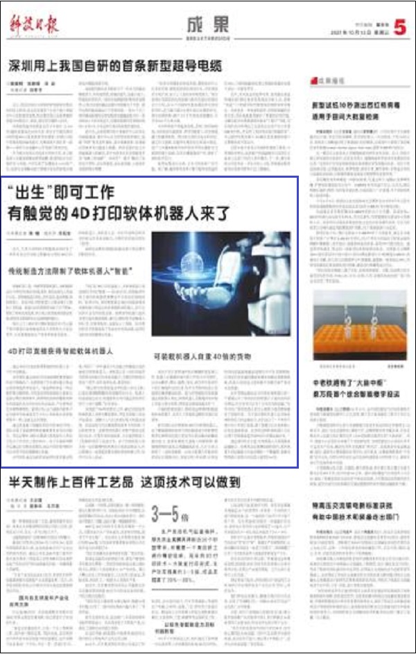 “我们在3D打印的基础上,为软体机器人制造增加‘时间’维度——即4D打印,将智能材料加工成对热刺激具有响应行为的动态结构材料。”封伟介绍,我们希望通过4D打印能获得具有感知能力和适应性的智能软体机器人,而不是仅仅只会变形的致动器。如果软体机器人能具有更丰富的驱动现象,就可以模仿更多动物或人的行为,实现智能化,也就是人工智能。而目前的研究多数都是基于弯曲变形的致动器,这仅仅是初步的刺激响应性能。