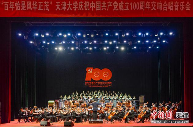 6月17日晚,由天津市文明办、市委教育工委、市教委、团市委和天津大学联合主办的“百年恰是风华正茂”——庆祝中国 共产党成立100周年交响合唱音乐会在天津大学奏响。来自天津歌舞剧院歌剧团的艺术家们走进校园,携手天津大学北洋艺术团师生同台献艺,为在场观众呈现了一场精彩绝伦的视听盛宴。 中新社记者 佟郁 摄