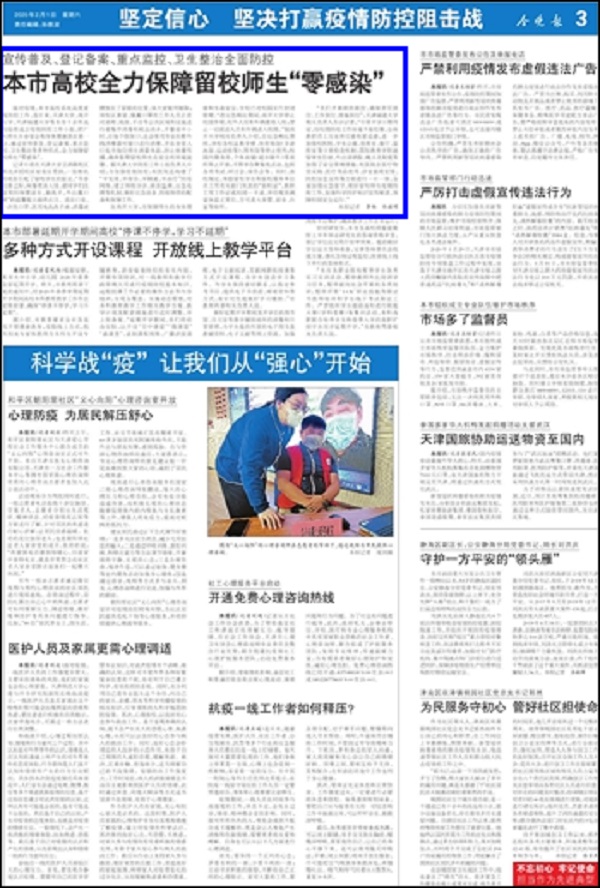 面对疫情,本市高校系统高度重视防控工作,连日来,天津大学、南开大学、天津城建大学等本市十余所高校陆续成立疫情防控工作小组,把广大师生生命安全和身体健康放在第一位,通过宣传普及、登记备案、重点监控、卫生整治等多种形式,全力保障留校师生“零感染”。