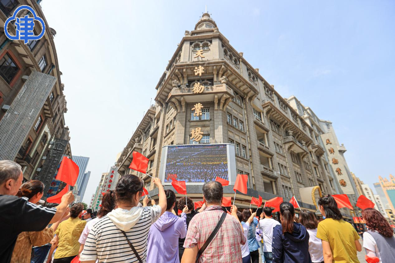 在天津的繁华商业街上,和平区劝业场街的市民群众围在商场大屏前,收听收看庆祝中国共产党成立100周年大会。