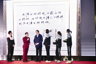 图① 著名作家、文化学者冯骥才为女排姑娘们送上祝福。