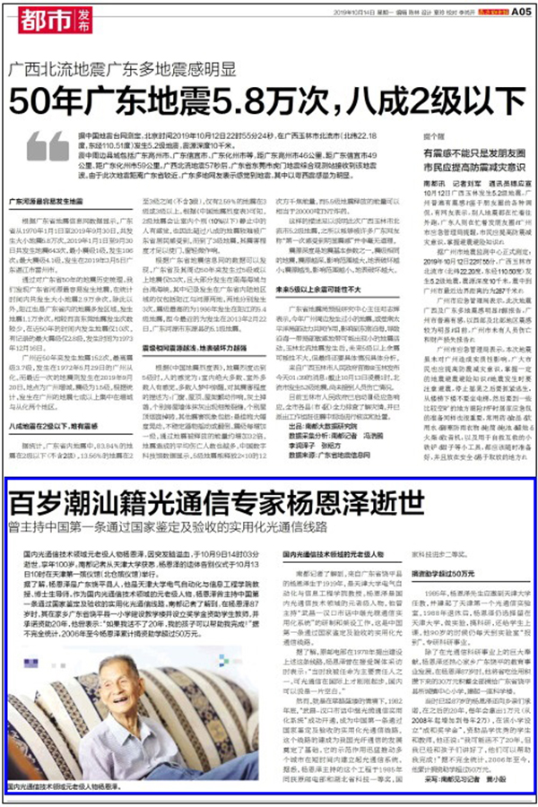 南都记者了解到,来自广东省饶平县的杨恩泽生于1919年,是天津大学电气自动化与信息工程学院教授。杨恩泽是国内光通信技术领域的元老级人物,他曾主持“武昌—汉口市话中继光缆通信实用化系统”的研制和架设工作,这是中国第一条通过国家鉴定及验收的实用化光通信线路。