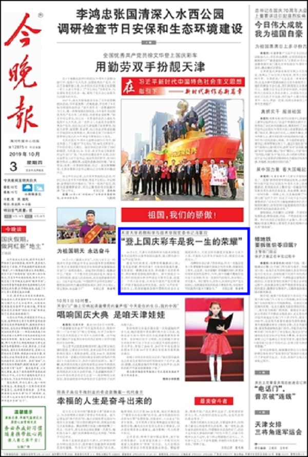 10月1日,天津大学药物科学与技术学院党委书记冯翠玲应邀参加国庆盛典,登上群众游行“从严治党”彩车。