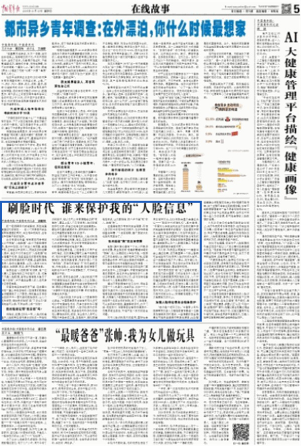值得注意的是,人脸信息又不同于密码和指纹,它的搜集过程可以是不被察觉的,被识别者可能在没有意识或没有直接接触时,就被采集信息。很多时候人们在“被刷脸”,而自己却连说“不”的机会都没有。你走在路上、坐在地铁里,脸部信息可能就在不知不觉中被搜集走了,可你却丝毫意识不到。