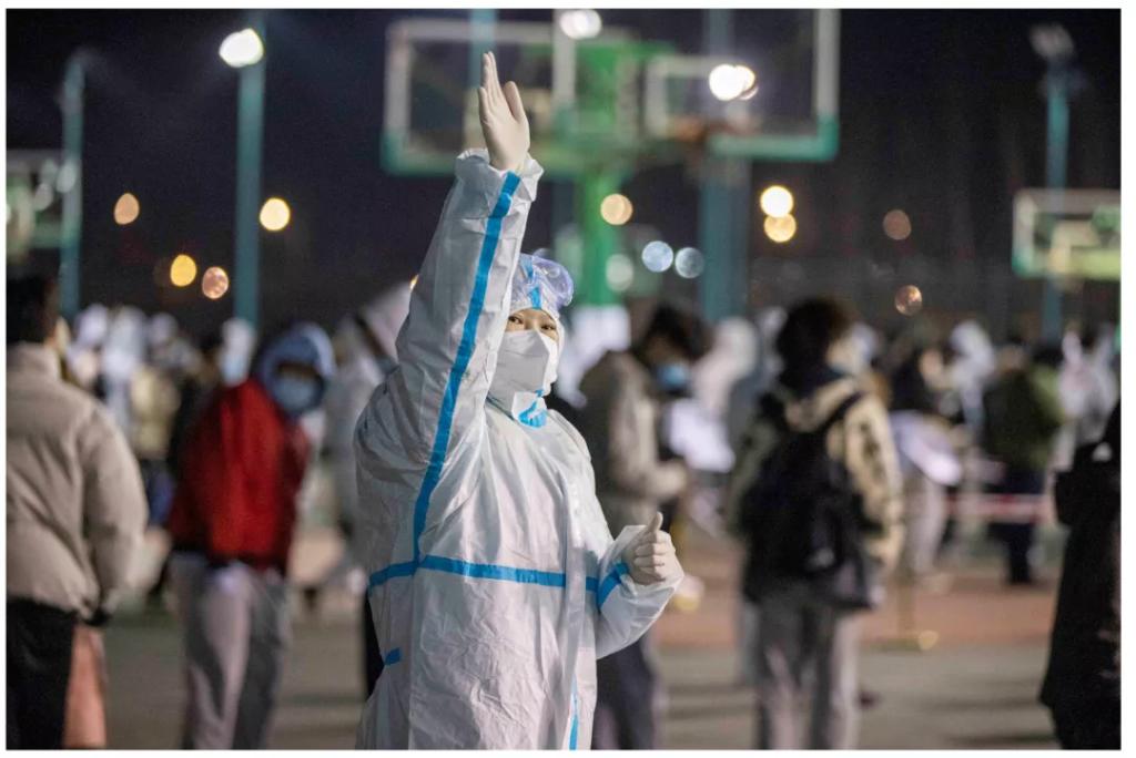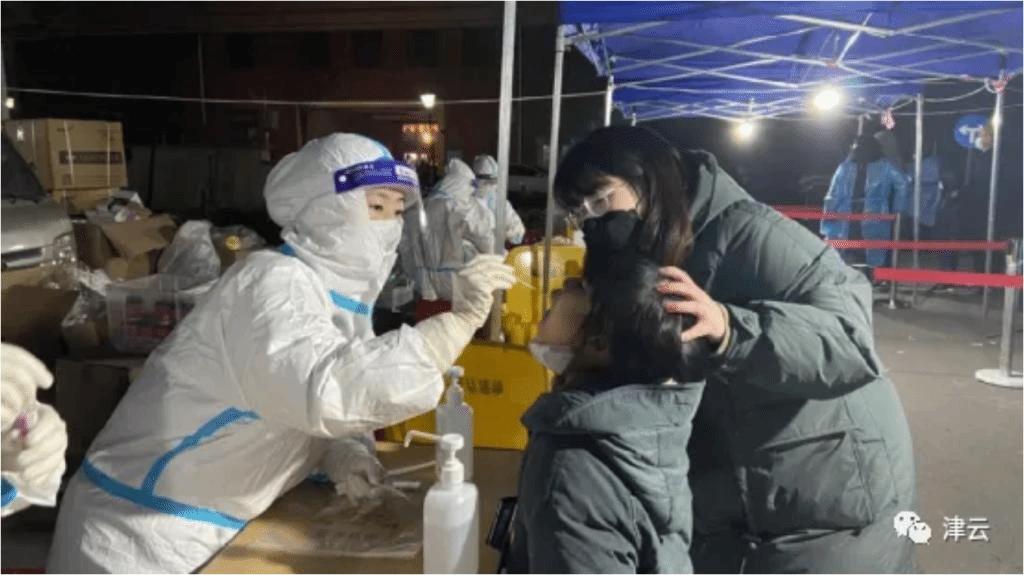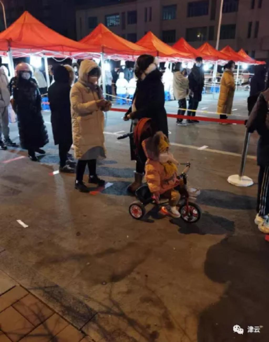 9日凌晨,在最早发现阳性感染者的津南区,身着防护服的志愿者们冒着零下4度的低温,有序引导市民保持距离排队,等待做核酸检测。