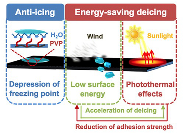 天津大学张雷教授团队利用新型两亲性材料结合光热碳纤维,研发出一种利用太阳光产热的“超级涂层”。该涂层性能优异的关键在于将可降低冰点的亲水材料、低表面材料与光热碳纤维有机融合,不仅能有效阻止结冰形成,吸收太阳光产热除冰,还降低了涂层表面的冰附着力,可使积冰在阳光的照射下,仅依靠风力、重力等自然条件轻松去除。