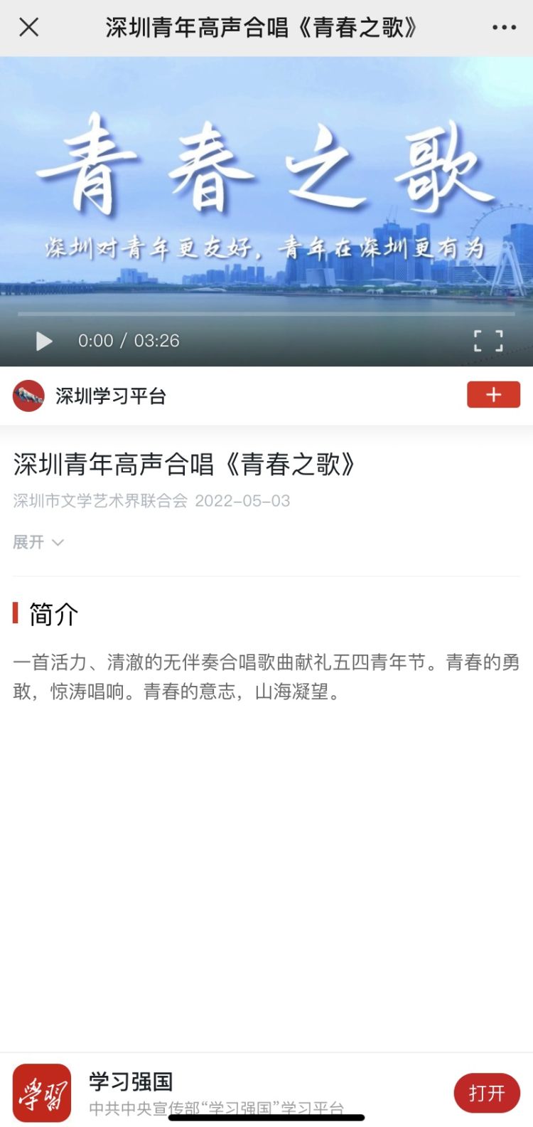今年是建团百年,“创作团长“王芳又被团市委委以重任。在五四青年节前,这首《青春之歌》终于完成了录音和视频制作,4月30日由深圳市文联率先发布后,就被学习强国的“广东音乐”选中推荐发布,未几,不常推荐原创文艺作品的《深圳发布》也发了歌曲视频,同行赞王芳创作太给力。话音刚落,“深圳青年高声合唱《青春之歌》”这个视频就登上了学习强国总台。