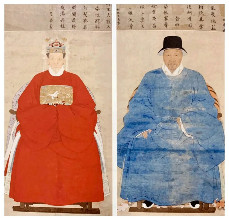 慈城镇上住着一位我的族姐叫冯一敏,她收藏着我家族的族谱和几幅祖先的画像,邀我去她家看。她家住在一条名叫太阳殿路的老街上,院内草木繁茂,房子矮小破旧。冯一敏先给我看《慈溪冯氏启承词家谱》——这正是我家十分珍贵的族谱,然后从隔壁一间小屋的阁楼上取下几卷很残破、带些霉味的轴画,打开之后却令我吃惊。一种静穆冲和之气显示出惟“大明”才有的韵致。画中石青与朱砂几种颜料历久犹鲜。钱文华从画像上端池堂题写的名款,证实了这是我家族至少五百年前的祖先,使我看到先人的真容,叫我肃然起敬,又惊喜不已。