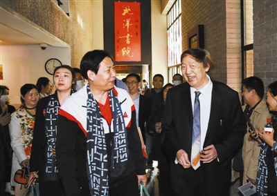 冯骥才先生(右)与天津女排主教练王宝泉交流。张立摄