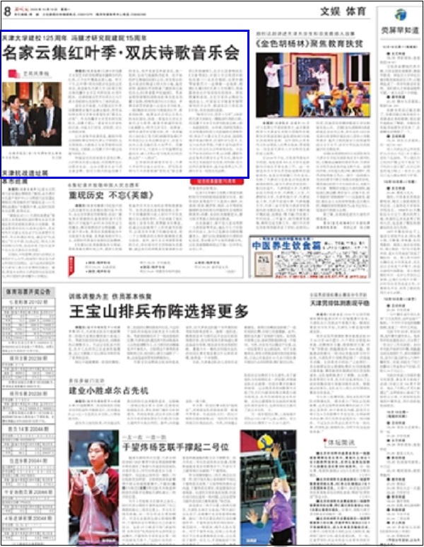 本报讯(记者高丽)天津大学冯骥才文学艺术研究院满墙青藤转为灼灼红色,片片红叶飘落在澄心池。昨天下午,红叶季·双庆诗歌音乐会在这里举办,诗意献礼天津大学125周年校庆和冯骥才文学艺术研究院15周年院庆。京津两地文艺界知名人士与天津大学的师生共同参与了本次活动。