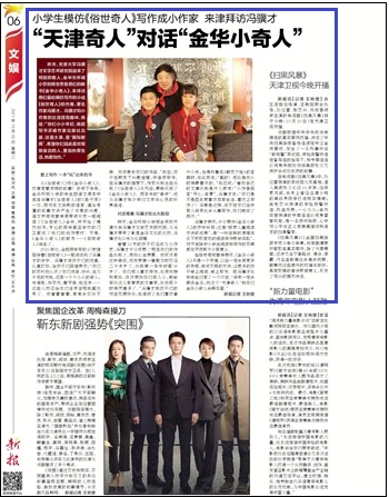 昨天,天津大学冯骥才文学艺术研究院迎来了特别的客人,金华市环城小学的师生带着他们的新书《金华小奇人》,来拜访他们最初模仿写作的小说《俗世奇人》的作者、著名作家冯骥才。冯骥才和小作者的交流饶有趣味,他说:“你们小小年纪,就能写书还被作家出版社出版,这是大事,是‘国际新闻’,希望你们因此喜欢观察身边的人,更加热爱生活、热爱创作。”