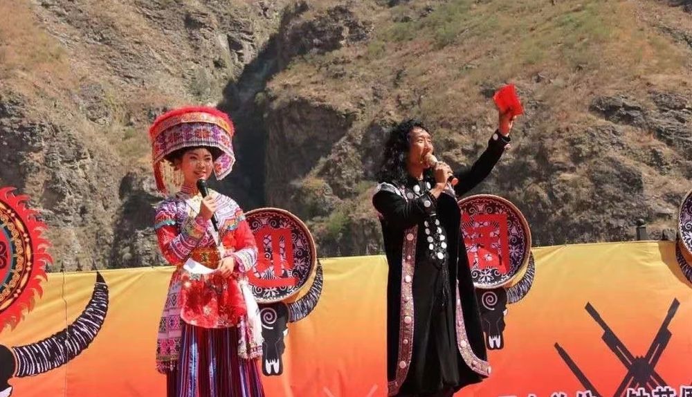 2018年2月25日,在云南省大理白族自治州宾川县钟英傈僳族彝族乡易地扶贫搬迁安置点举行的傈僳族传统节日阔时节上,谷文瑾(左)担任活动主持人。(受访者供图)