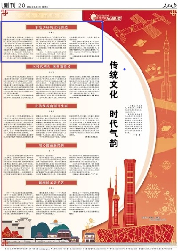 这是一年一度的文化盛宴,这是全民参与的文化创造。它反映的是一代代中国人对生活的热爱:我们把一个自然的日子创造成一个文化的日子,把一个寻常的日子变成一个充满理想光彩的日子。这是多么美好、神奇的创造!