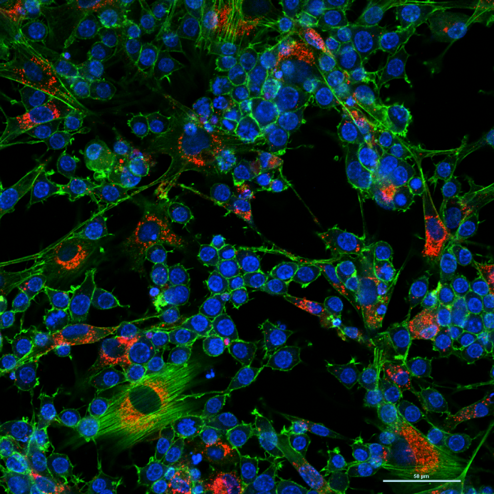 间充质干细胞/巨噬细胞混合细胞培养中细胞对纳米材料的摄取,红色是纳米材料,蓝色是细胞核,绿色是肌动蛋白。作品展示了混合细胞培养中,纳米材料选择性地被间充质干细胞摄取,图片细节布局到位,内容饱满,展现艺术性与科学性共存之美。