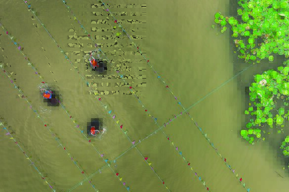 5月28日,在浙江省湖州市吴兴区东林镇倪家湾自然村,村民在荷塘内参加端午划菱桶趣味活动。