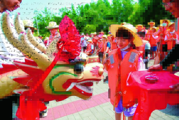 6月3日,在河南省洛阳市凌波湖,一名小朋友参加趣味龙舟赛点睛仪式。