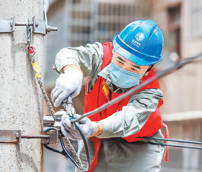 湖北省荆州市路灯管理服务中心的服务队成员在社区安装路灯。黄志刚摄(人民视觉)