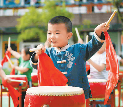 近日,安徽省铜陵市义安区新桥矿幼儿园的孩子们在操场上练习敲鼓。过仕宁摄(人民视觉)