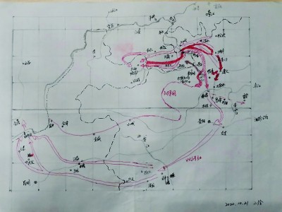 为了精准还原四渡赤水场景,在搜索了大量的图片史料之后,程斯宇以“四渡赤水”和“巧渡金沙江”的地图作为蓝本反复练习绘制,并在教育中依据学生反馈不断完善,形成后来的二稿、三稿。