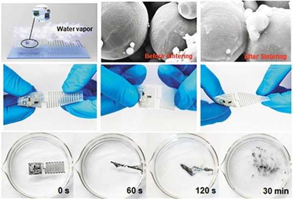 水致烧结示意图和烧结前后对比,以及烧结后器件柔性展示和溶解特性。 (资料图片)