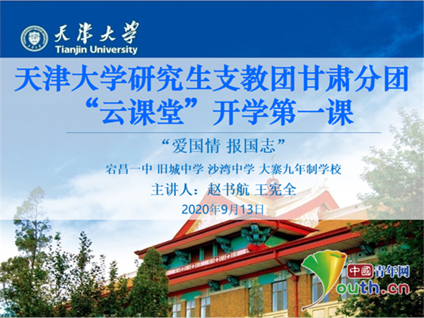 中国青年网北京9月16日电(记者 李彦龙)9月13日晚,在甘肃省宕昌县四所学校(宕昌一中、旧城中学、沙湾中学、大寨九年制学校)里,来自四个班级共200余名学生聆听了天津大学“云课堂”开学第一课。天津大学化工学院辅导员赵书航、天津大学精仪学院博士生王宪全通过服务地学校的梦想教室,跨越1700公里的距离,为宕昌县的孩子们讲述了有关“爱国、报国和强国”的故事。