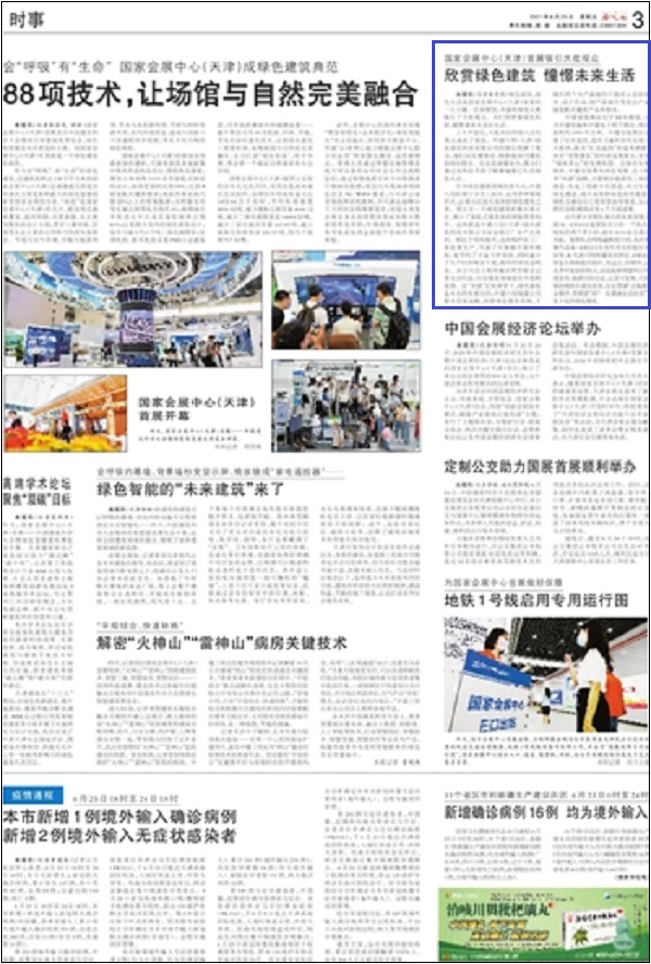 本报讯(记者张家民)绿色建筑、绿色生活是国家会展中心(天津)首展的一大主题。在各展馆,丰富的绿色元素吸引了大批观众。人们欣赏着绿色科技,畅想着未来美好生活。