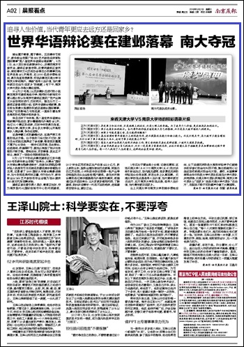 辩论属于青春,属于青年。五四青年节前夕,新华报业传媒广场369艺术剧场迎来首轮国际赛事“第八届世界华语辩论锦标赛”。5月1日,由人民日报社新媒体中心、共青团南京市委员会、建邺区委宣传部、共青团建邺区委员会、君和青年文化交流协会等主办的赛事历经世界各地461所高校,近2000名选手唇枪舌剑,激烈角逐思想激荡,终场决赛在天津大学与南京大学间展开。围绕“追寻人生价值,当代青年更应去远方/回家乡”的辩题,1号下午,南京大学代表队夺得大赛总冠军。