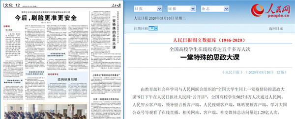 复旦大学利用网络平台构建“云上思政”大格局。复旦大学网络空间国际治理研究基地为学生讲授一堂“抗击新型冠状病毒——一场全球治理的压力测试”的思政课。该课在哔哩哔哩网站上直播,收获极高人气。