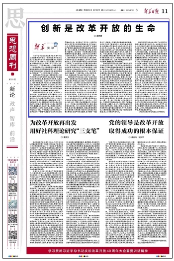 创新是改革开放的生命,是辩证唯物主义和历史唯物主义世界观和方法论在改革开放实践中的证明和实现,既是创新的历史规律,也是改革开放的哲学基础。在改革开放40年新的起点上,强调创新是改革开放的生命,勇敢推进理论创新、实践创新、制度创新、文化创新以及各方面创新,是让中国人民和中华民族在历史进程中积累的强大能量更加充分爆发,为实现中华民族伟大复兴提供势不可当磅礴力量的根本途径。