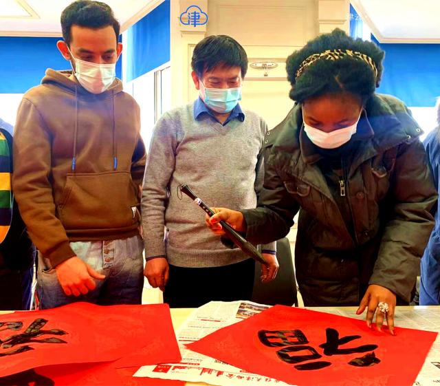 当天,天津大学国际教育学院还举办了“中国传统文化游园会”,来自19个国家的留学生代表欢聚一堂,在文化学者的讲解指导下学习春节习俗,一起写对联、剪窗花,其乐融融中体验中国传统文化。“将福字倒过来贴,居然有‘幸福已到’的意义!”来自喀麦隆的财务管理专业留学生奈丽对此兴奋不已,“今天的活动让我深深感受到中国文化的魅力,更感受到学校对我们这些异国学子的爱护和关心。”(策划制作 马庚申 文字摄影 李杨)
