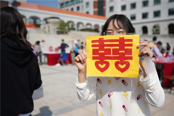 在厦门大学举办的新春茶话会游园活动中,学生展示学习剪纸的成果。