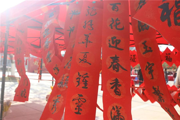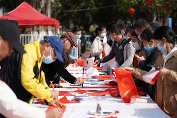 在厦门大学举办的新春茶话会游园活动中,老师们贡献墨宝,将春联和美好的祝福送给学生。