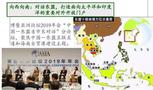 对话东盟打造面向太平洋和印度洋的重要对外开放门户。东南亚是中美争夺的重要战略要地。海南地处北部湾和南海的中心位置,东盟与海南地缘相近、人文相亲、经济互补性强,是海南自贸区(港)对外合作的首选方向。
