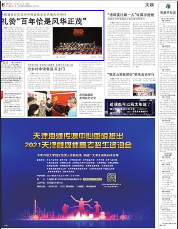 本报讯(记者高丽)为献礼党的百年华诞,“百年恰是风华正茂”庆祝中国共产党成立100周年交响合唱音乐会,昨晚在天津大学北洋园校区求实会堂举行。