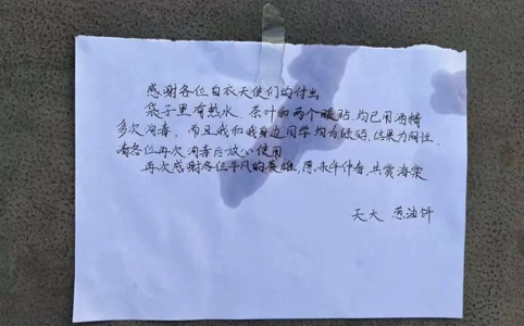 医务工作者的付出也被天大的同学悄悄关注和惦记。他们悄悄准备了小纸条表达感谢。